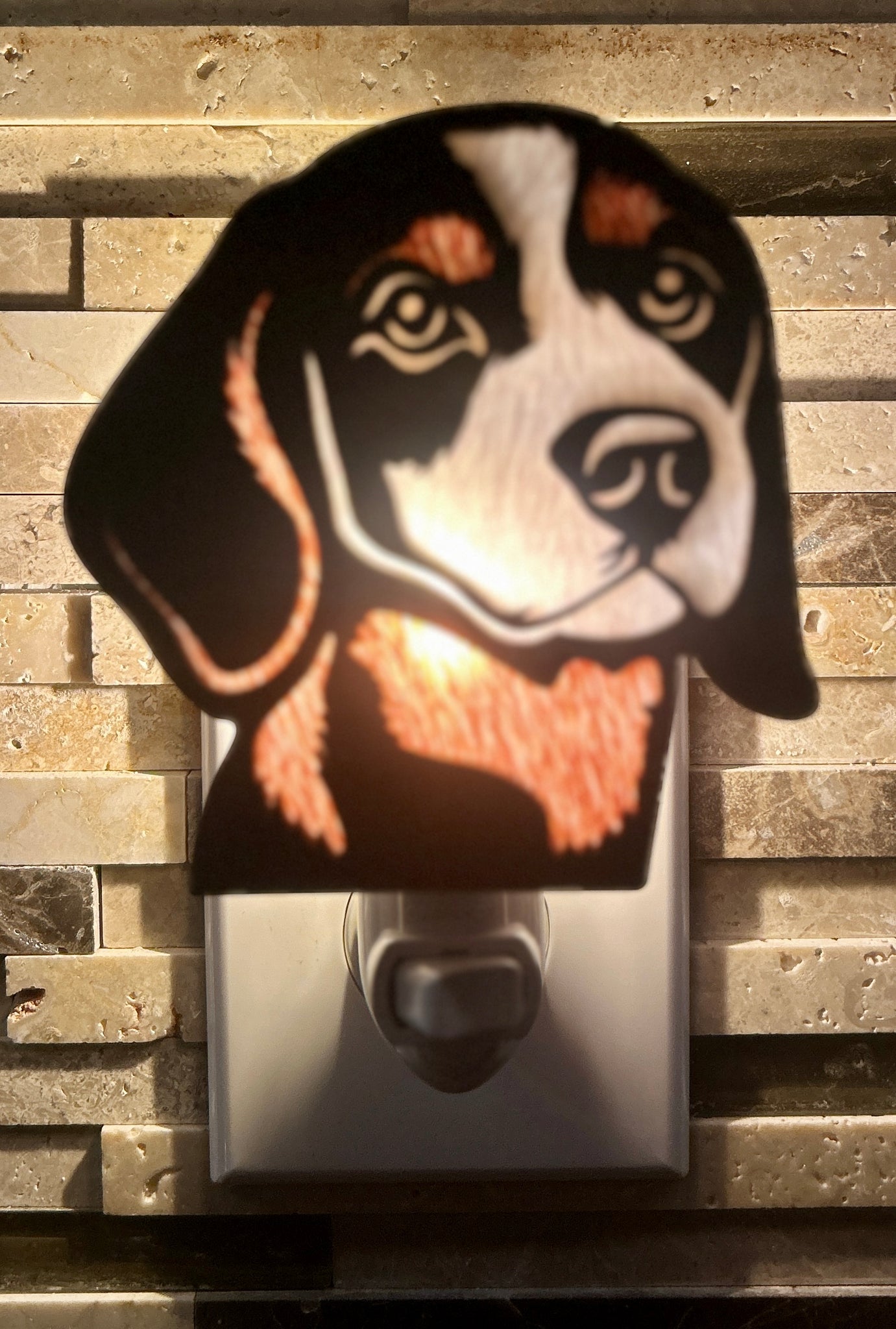 This tri-color Beagle dog night light is designed to reflect the breed’s curious, friendly personality and classic hound expression. Crafted from a wood base and layered acrylic selected to reflect traditional tri-color markings, the design captures the Beagle’s distinctive look with a gentle, understated glow.