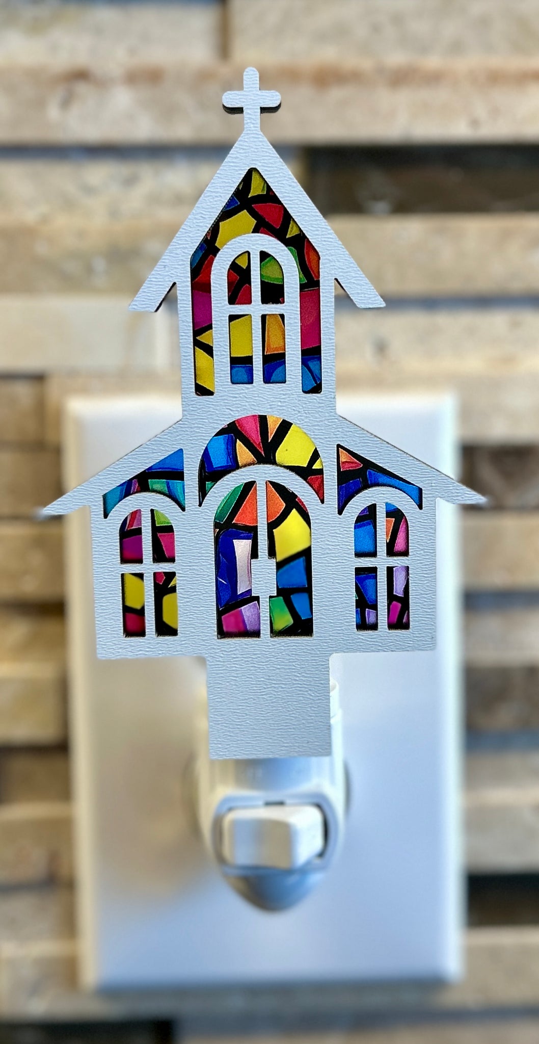 This country church night light features a white church silhouette with stained glass patterned windows. Light shines through the window details, creating a soft, welcoming glow.