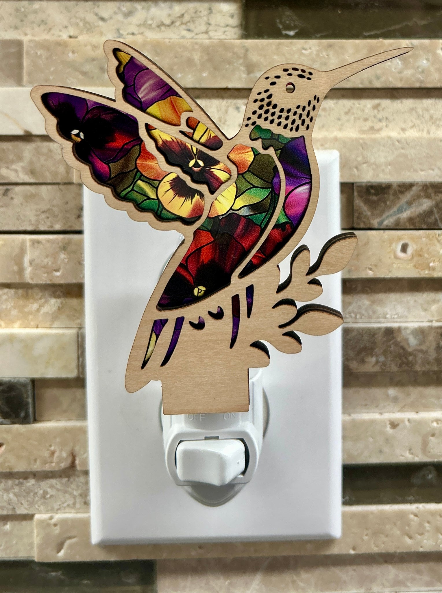 This hummingbird night light features a clean, simple silhouette paired with a colorful pansy floral patterned acrylic. Crafted from a maple wood base and layered acrylic, the design highlights the hummingbird shape while providing a gentle, understated glow.