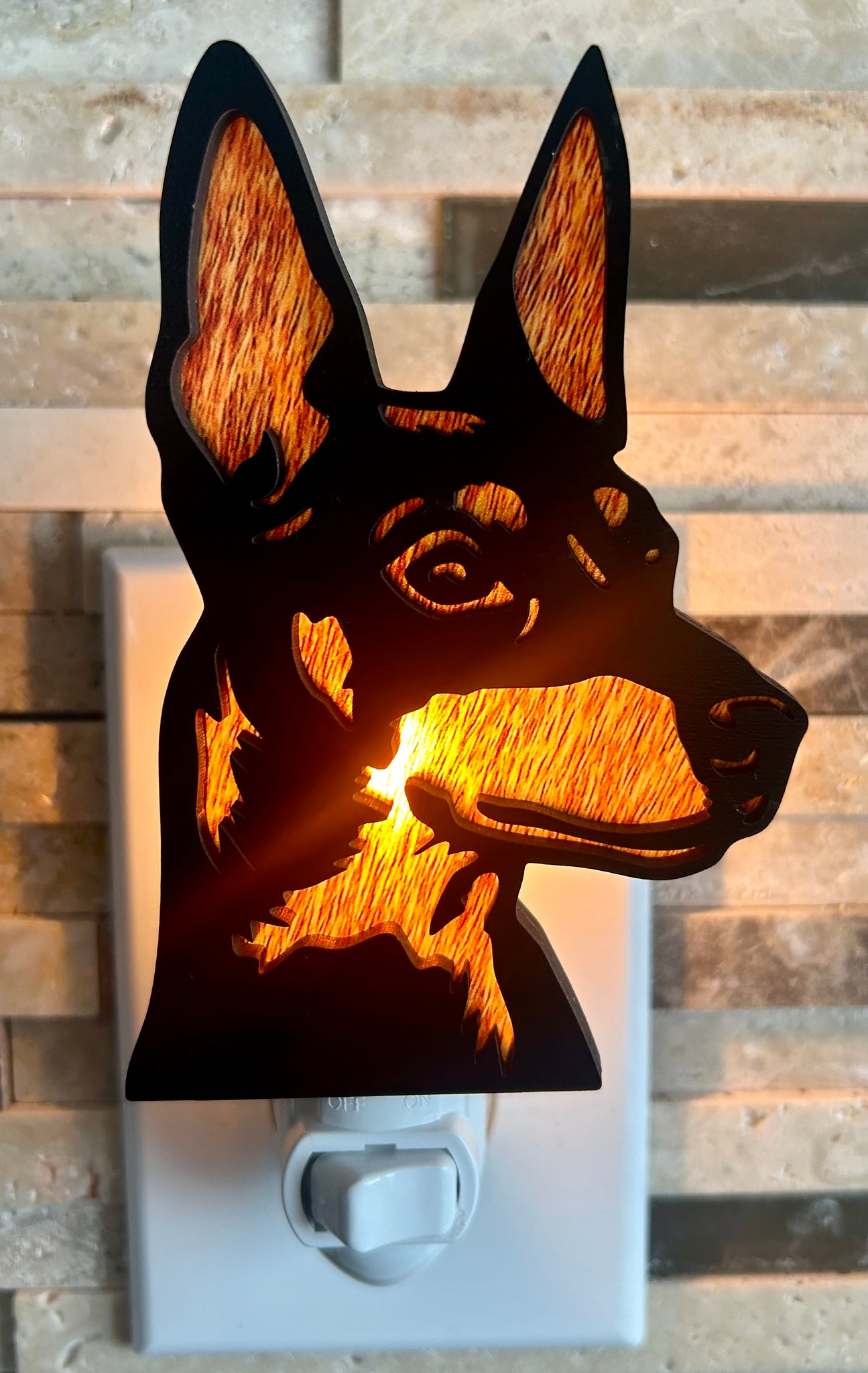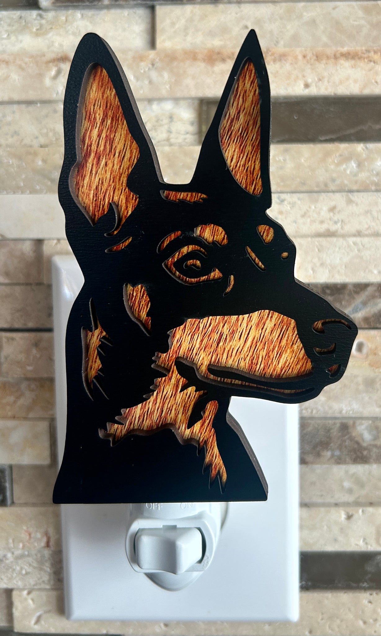 This Miniature Pinscher dog night light is crafted from a wood base and acrylic selected to reflect the breed’s distinctive black and tan coloring. The layered dog night light design captures the alert Min Pin silhouette, echoing the breed’s small size and energetic, fearless personality, while providing a soft, low glow. The finished piece has a clean, consistent appearance that keeps the focus on the bold outline of this lively breed.