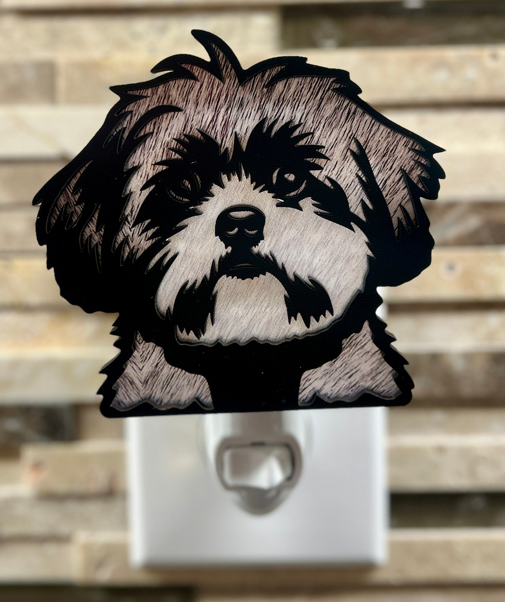 This Shih Tzu dog night light is designed to reflect the breed’s affectionate nature and distinctive, expressive face. Crafted from a wood base and layered acrylic selected to reflect the breed’s coloring, the design highlights the recognizable Shih Tzu profile with a gentle, understated glow.