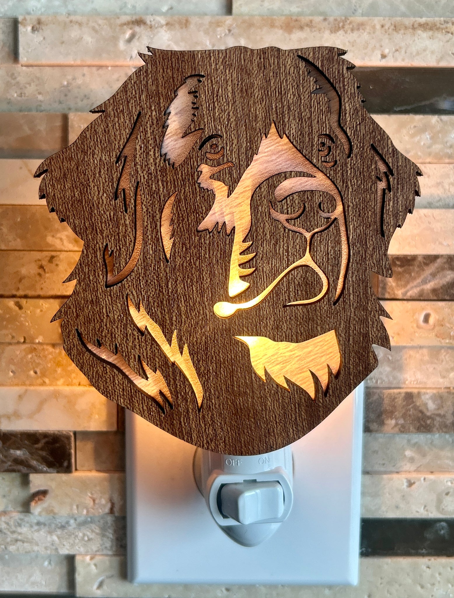 This St. Bernard dog night light is crafted from a sapele wood base and white fur–printed acrylic selected to reflect the natural coloring of the breed. The layered dog night light design highlights the recognizable St. Bernard silhouette while providing a soft, low glow. Natural variation in the wood grain makes each piece unique.