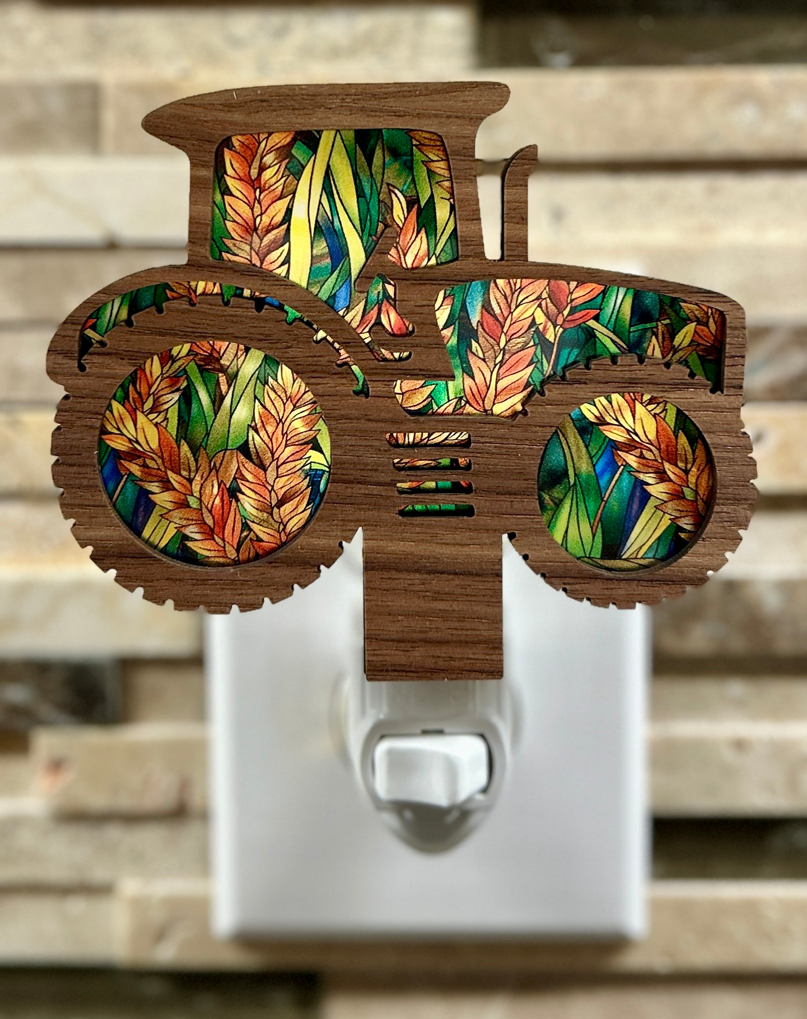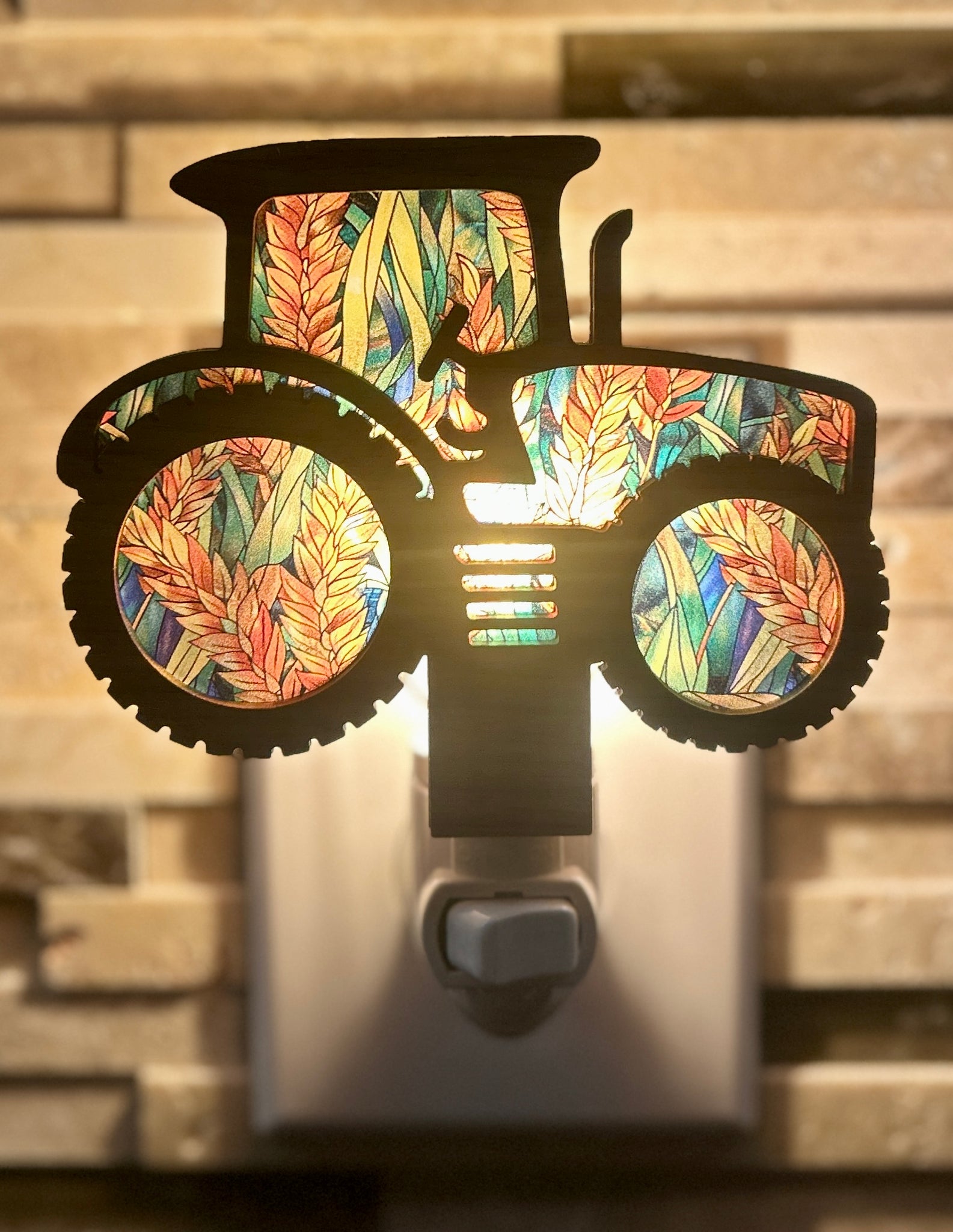 This tractor night light reflects the steady rhythm of harvest season across Kansas and the Midwest. Crafted from a walnut wood base and layered acrylic featuring a wheat pattern, the design highlights the familiar tractor silhouette with a warm, natural glow.