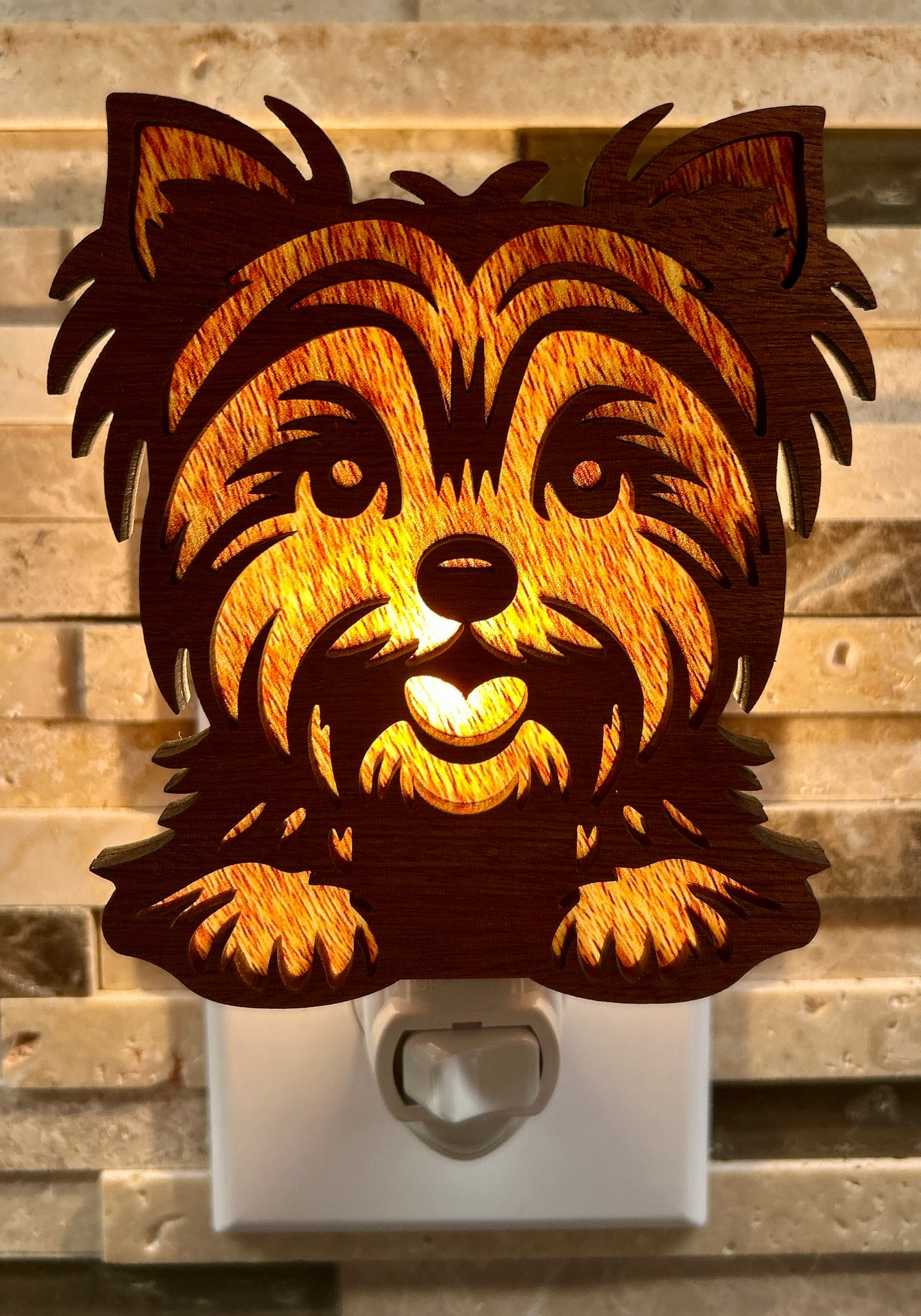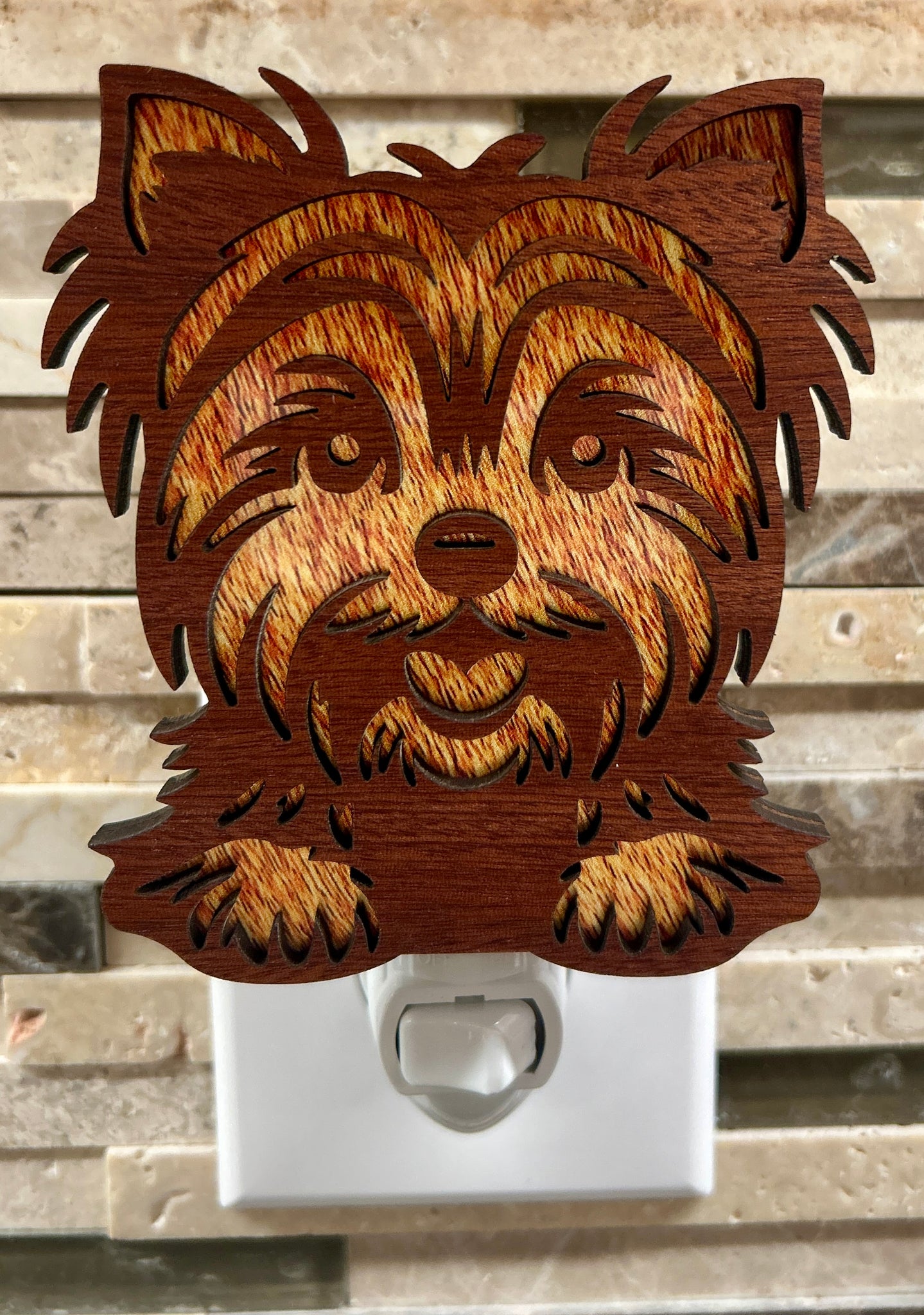 Light up your space with this Yorkshire Terrier (Yorkie) dog night light, designed to capture the breed’s small size and confident, lively personality. Crafted from a sapele wood base and layered acrylic selected to reflect the breed’s coloring, the design highlights the recognizable Yorkie silhouette while providing a soft, soothing glow.